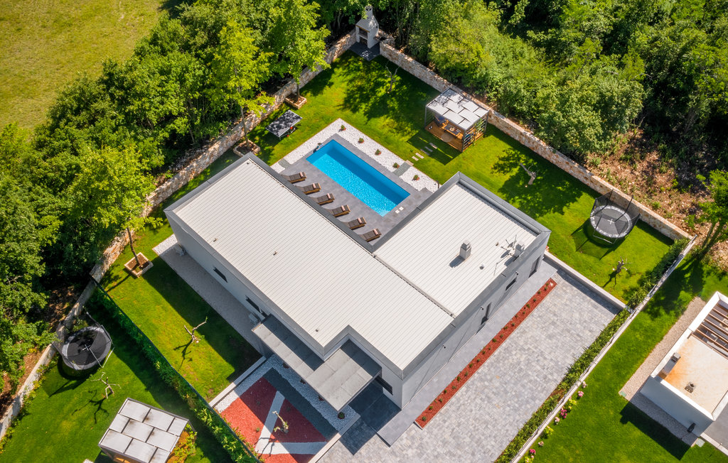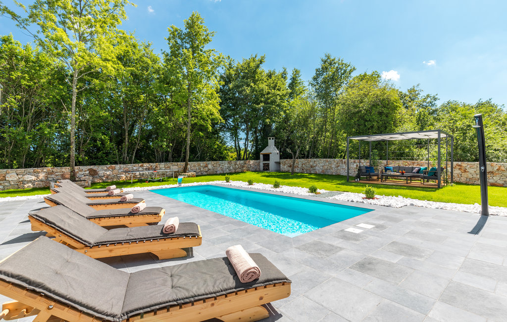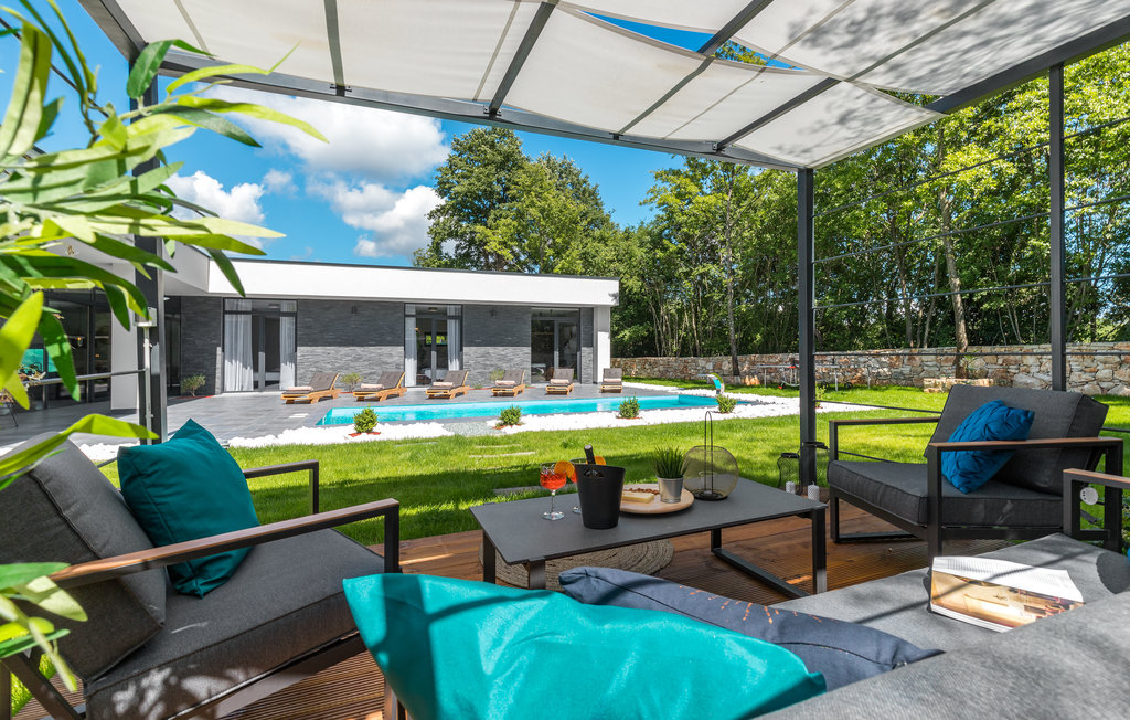 Exclusive villa with pool and wellness area is located in a quite area overlooking the green landscape and a forest, which offers you peace and privacy. This impressive holiday house has a fenced garden of approx. 1200 m², a living space of approx. 150 m² as well as a covered terrace with outdoor kitchen and a wellness room with whirlpool and sauna. Another terrace with garden furniture offers additional comfort.