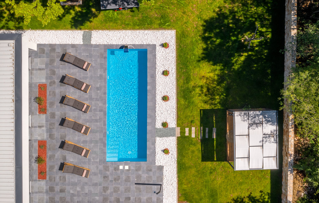 The spacious interior consists of an open living room with kitchen, which cosy flair is complemented by a fireplace. There are also two bedrooms with en-suite bathrooms as well as an additional bathroom in the living room. Many glass surfaces flood the interior with natural light and provide direct access to the terrace, pool and sun area.